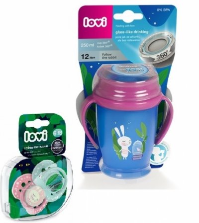 Lovi Kouzelný hrneček Junior 360° Králíček 12m+ - modro/růžový + 2ks dudlíků (3-6m)