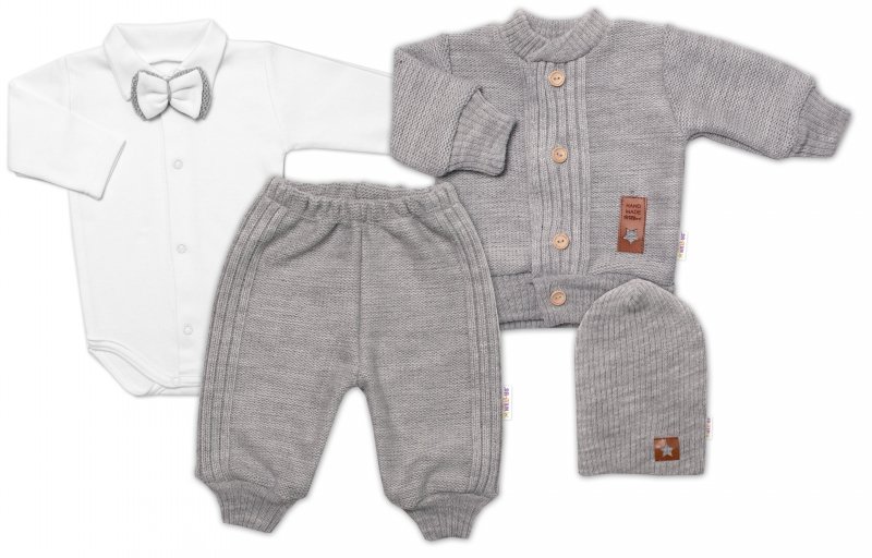 5-dílná pletená sada Baby Nellys, Boy, body, kalhoty, svetr, čepička, motýlek