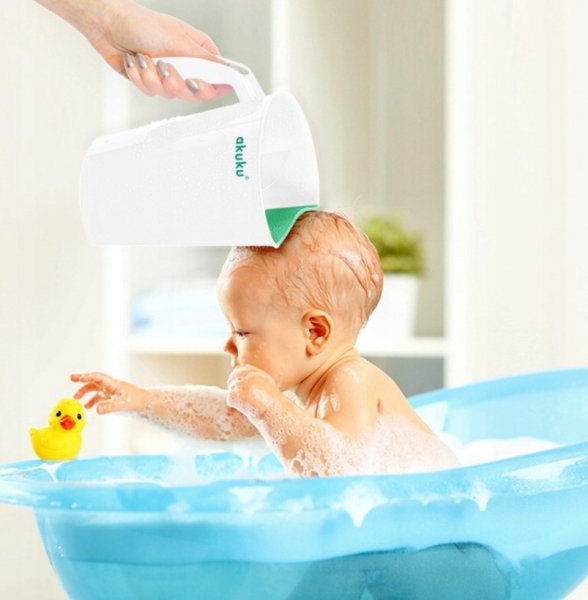 Pohodlný hrníček/kyblíček ke koupání, který usnaďnuje splachování těla a vlasů dítěte.