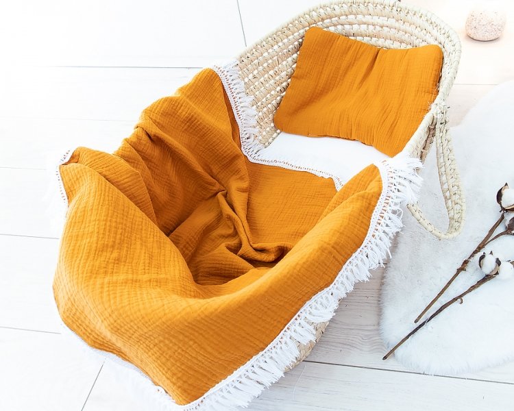 Baby Nellys 2-dílná Mušelinová sada BOHO, polštářek a přikrývka 70x100 cm, hořčicová