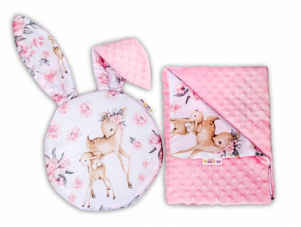 Baby Nellys 2-dílná sada do kočárku s minky s oušky - Srnka a růže, růžová
