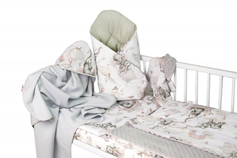 Baby Nellys 6-ti dílná výhod. sada s dárkem pro miminko, 120x90 Slon a duha, bílá/olivová - 120x90