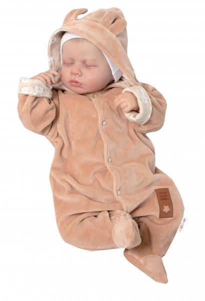 Dvouvrstvý teplejší velurový overálek podšitý bavlněnou látkou se stylovou kapucí ozdobenou ušima. Celorozpínací na cvočky, což umožňuje snadné převlékaní a přebalovaní.