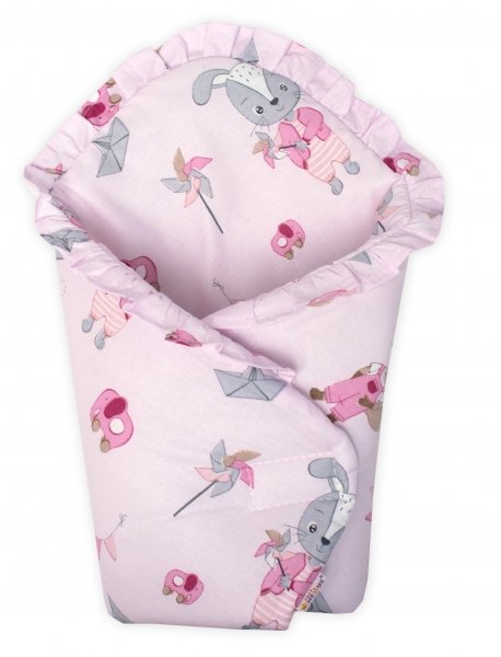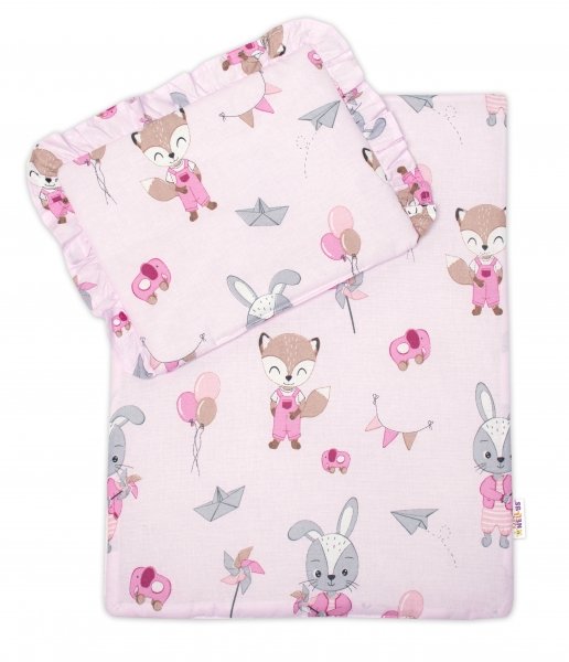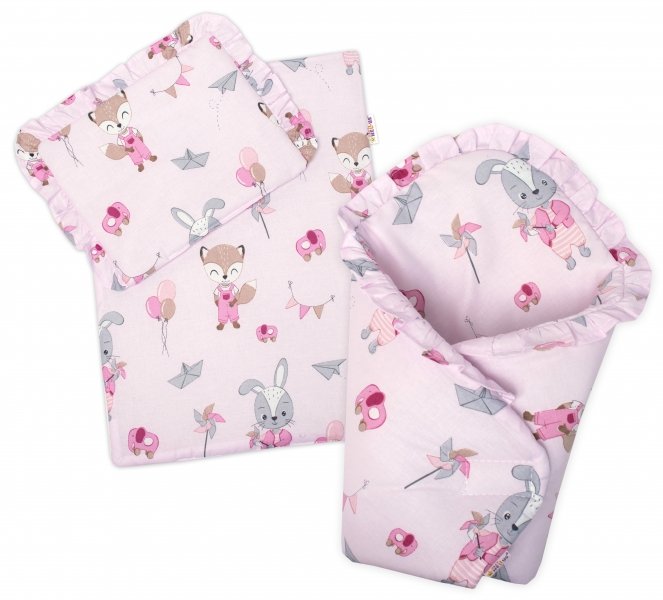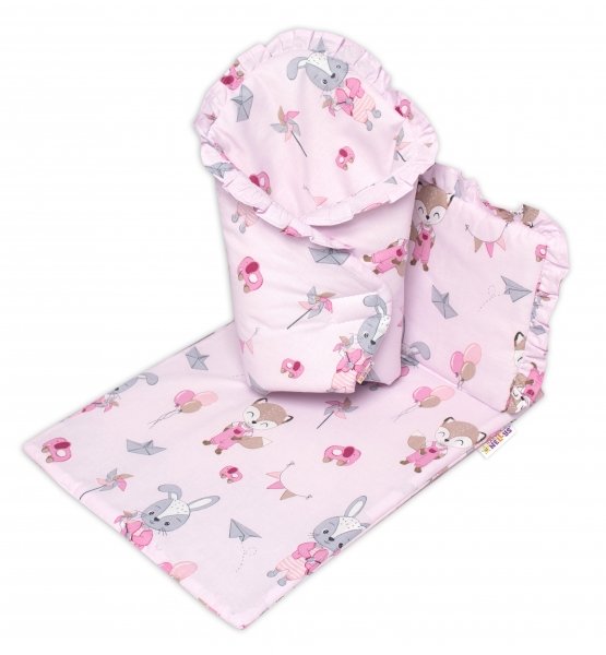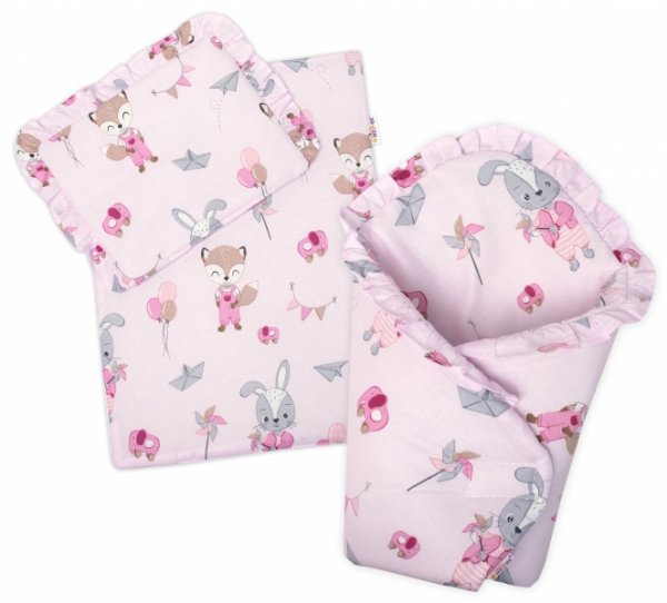 Baby Nellys Luxusní sada pro panenku -zavinovačka, peřinka a polštářek, Liška a zajíc,pink