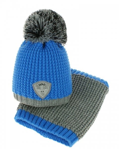BABY NELLYS Podzimní/zimní čepice s komínkem - bambulka - modrá/šedá