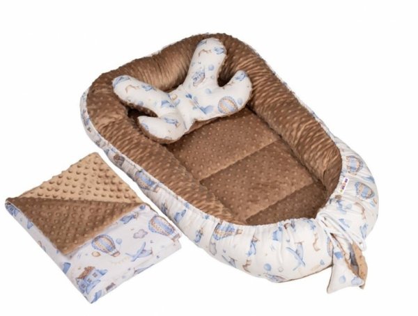Baby Nellys Sada komplet oboustr. hnízdečko s minky Balón a letadla, bílá/capuccino