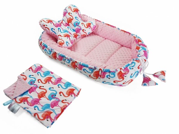 Baby Nellys Sada komplet - oboustranné hnízdečko, kokon minky 60x90cm - plameňák
