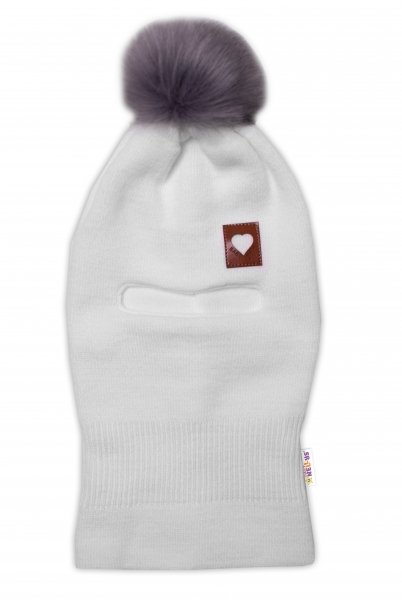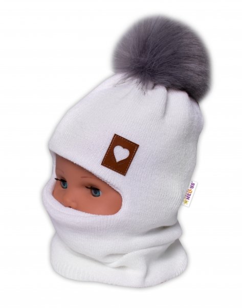 BABY NELLYS Zimní čepice/kukla s bambulí Love, bílá - 80-92 (12-24m)