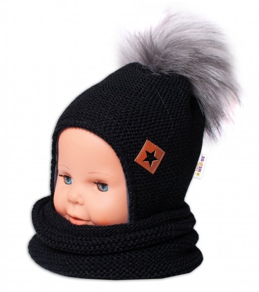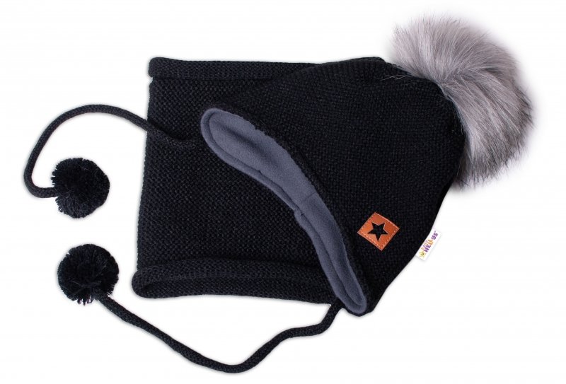 BABY NELLYS Zimní čepice s fleecem a chlupáčková bambule Star + komínek