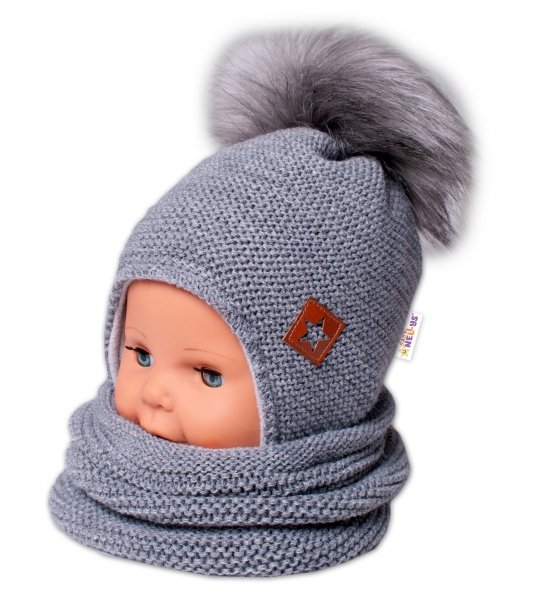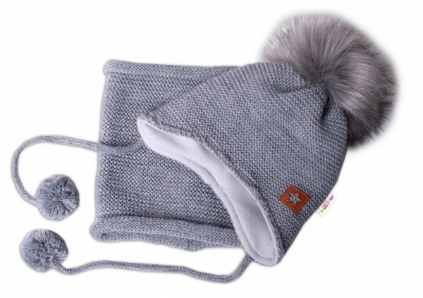 BABY NELLYS Zimní čepice s fleecem a chlupáčková bambule Star + komínek - šedá