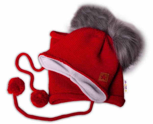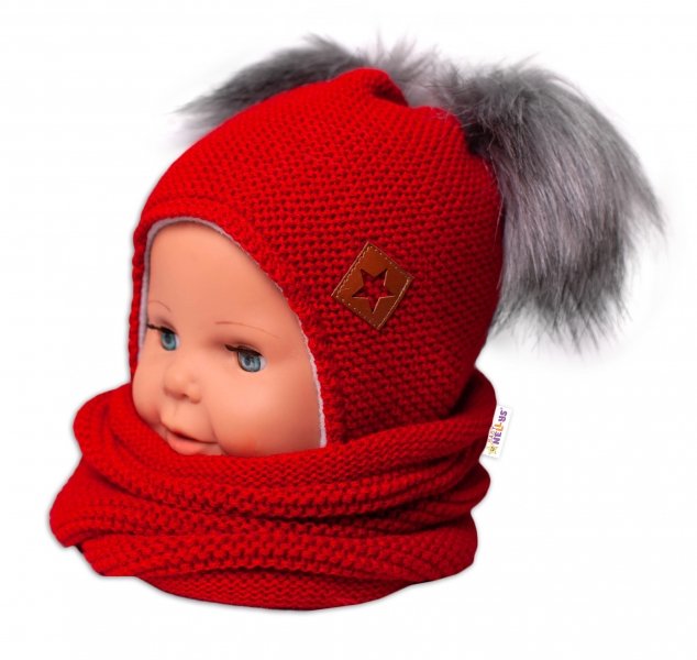 BABY NELLYS Zimní čepice s fleecem a chlupáčkové bambulky Star + komínek