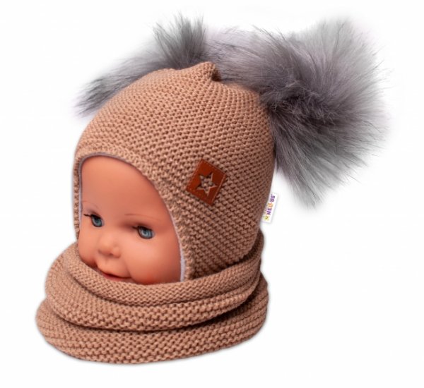 BABY NELLYS Zimní čepice s fleecem a chlupáčkové bambulky Star + komínek