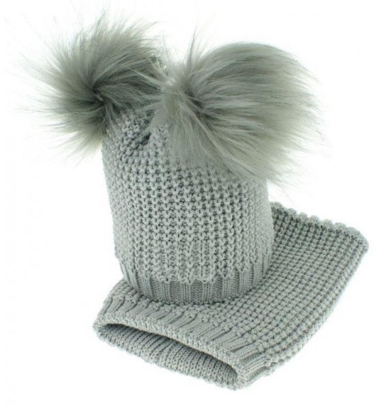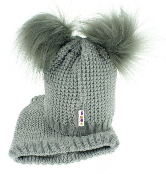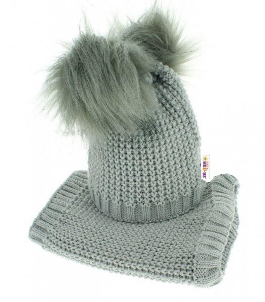 BABY NELLYS Zimní čepička s komínkem - chlupáčkové bambulky - šedá - 12/24měsíců