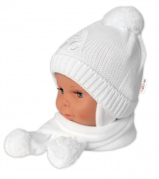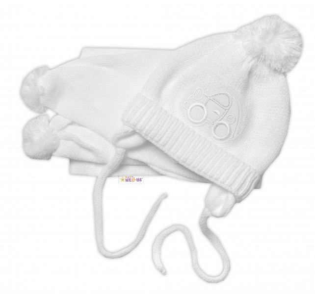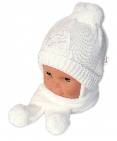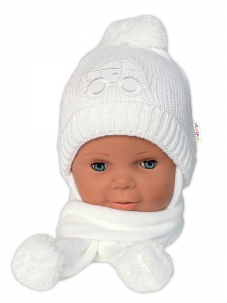 BABY NELLYS Zimní čepička s šálou - Autíčko bílá - 56-68 (0-6 m)
