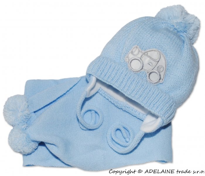 BABY NELLYS Zimní čepička s šálou - Autíčko sv. modré - 0/6 měsíců