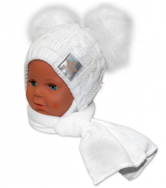 BABY NELLYS Zimní čepička s šálou - chlupáčkové bambulky - bílá,bílé bambulky - 6/18měsíců