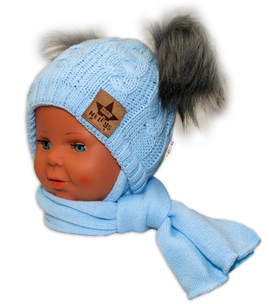 BABY NELLYS Zimní čepička s šálou - chlupáčkové bambulky - modrá, šedé bambulky - 6/18měsíců