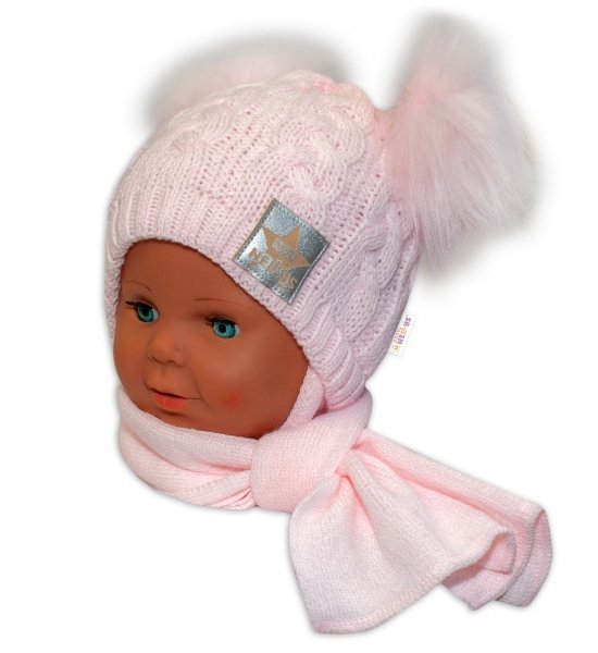 BABY NELLYS Zimní čepička s šálou - chlupáčkové bambulky - růžová, růžové bambulky - 6/18měsíců