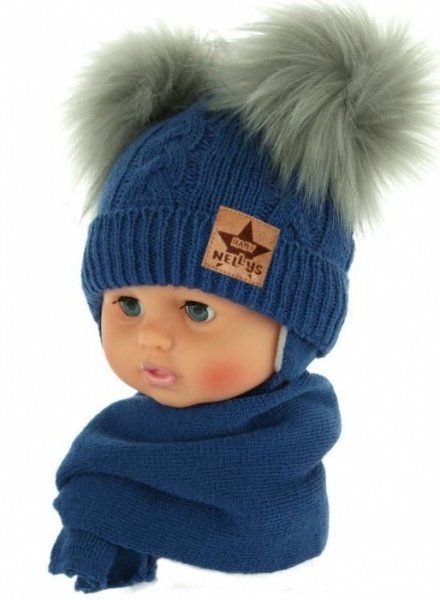 BABY NELLYS Zimní čepička s šálou - chlupáčkové bambulky - tmavě modrá, šedé bambulky - 6/18měsíců