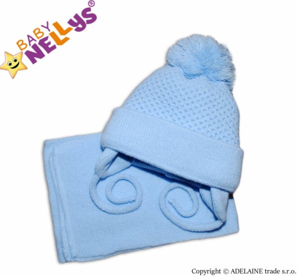 BABY NELLYS Zimní čepička se šálou - modrá s velkou bambulkou - 62/74