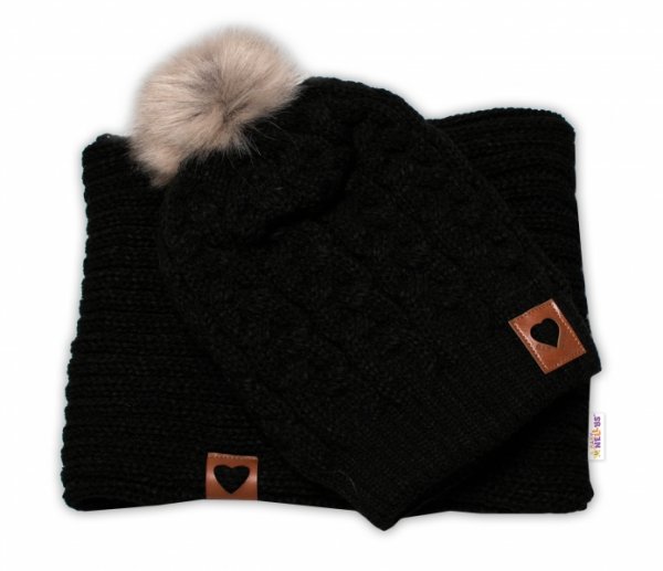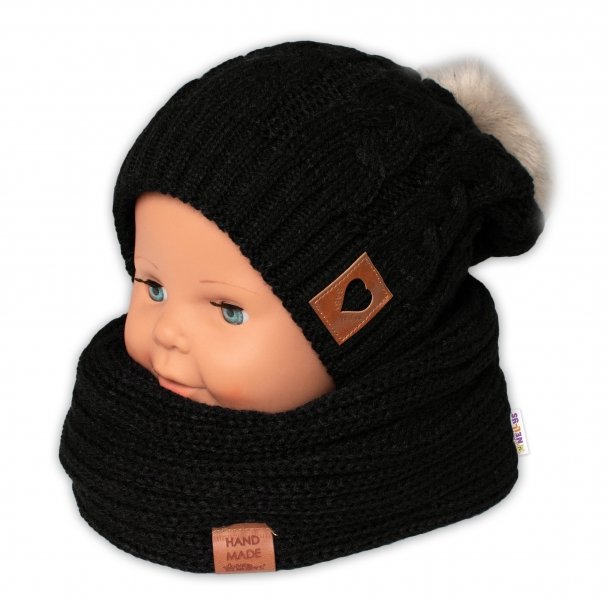 BABY NELLYS Zimní dvouvrstvá čepice s bambulí + komínek Love, černá - 104-110 (3-5r)