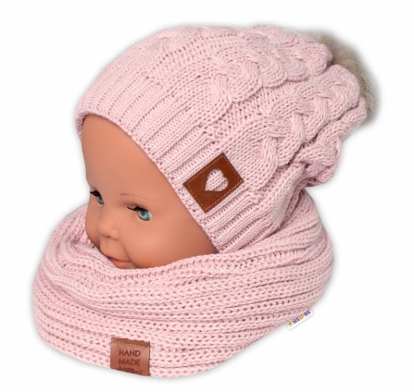 BABY NELLYS Zimní dvouvrstvá čepice s bambulí + komínek Love, pudrová - 104-110 (3-5r)
