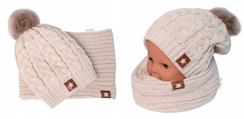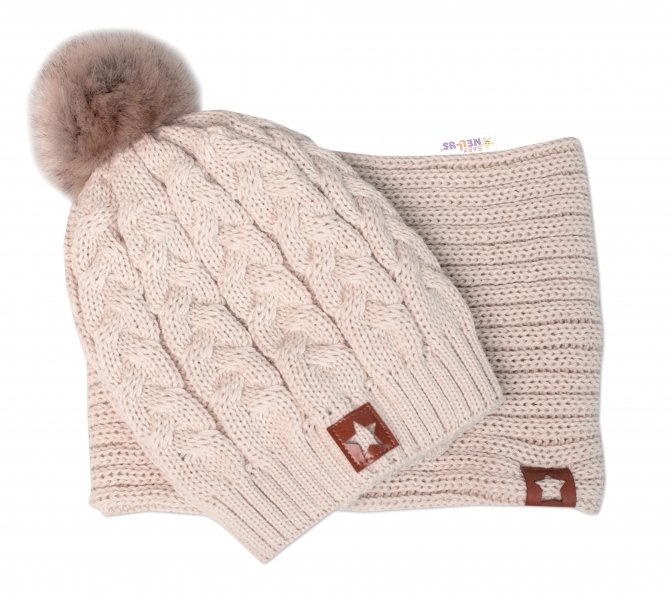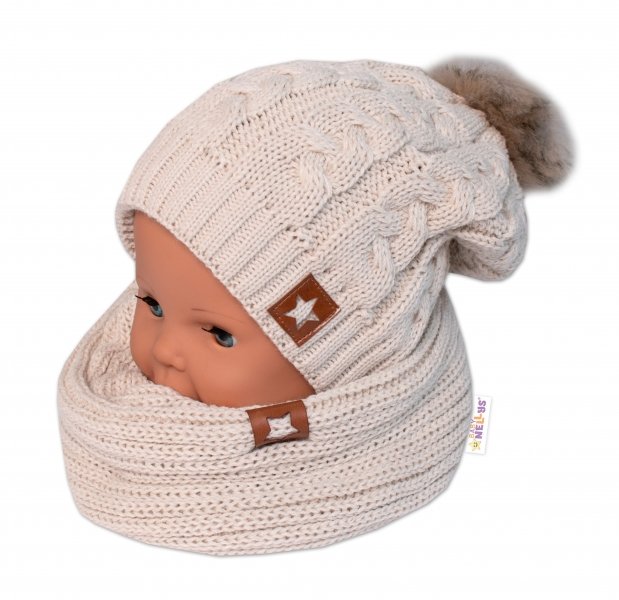 BABY NELLYS Zimní dvouvrstvá čepice s bambulí + komínek Star, béžová - 104-110 (3-5r)