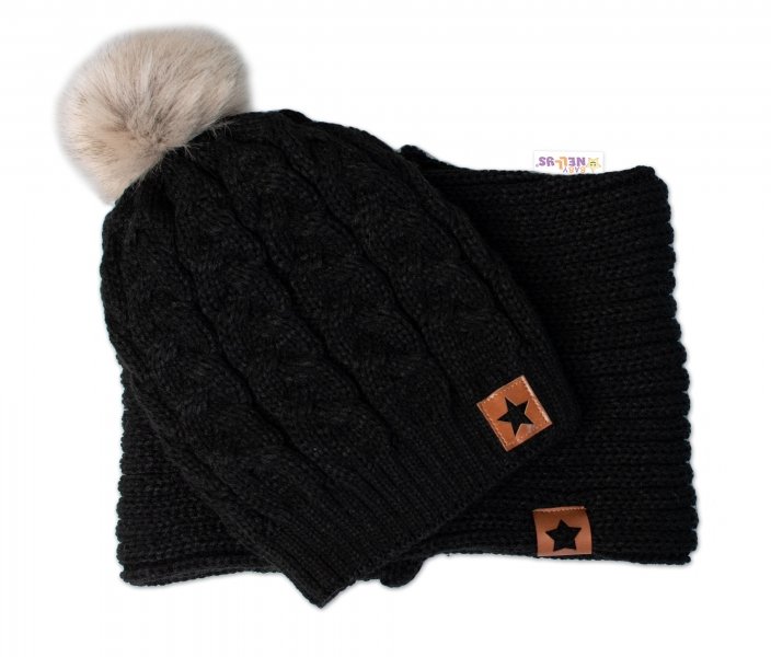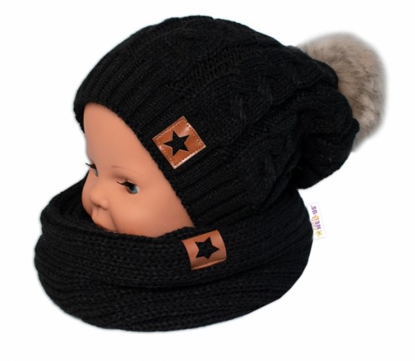 BABY NELLYS Zimní dvouvrstvá čepice s bambulí + komínek Star, černá - 104-110 (3-5r)