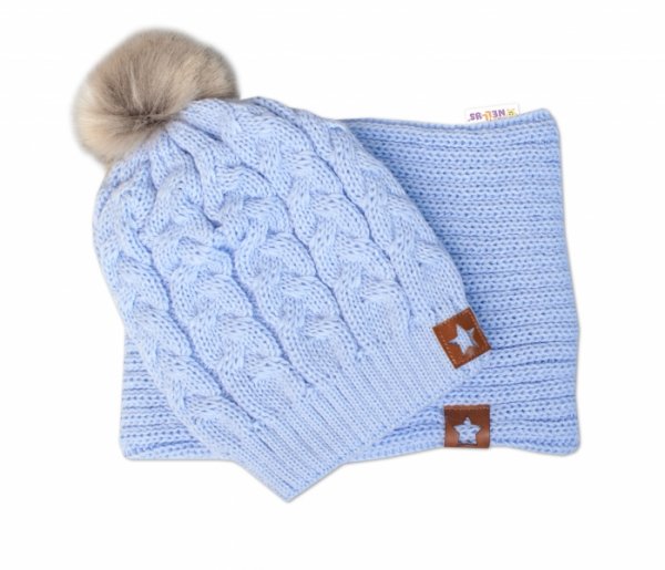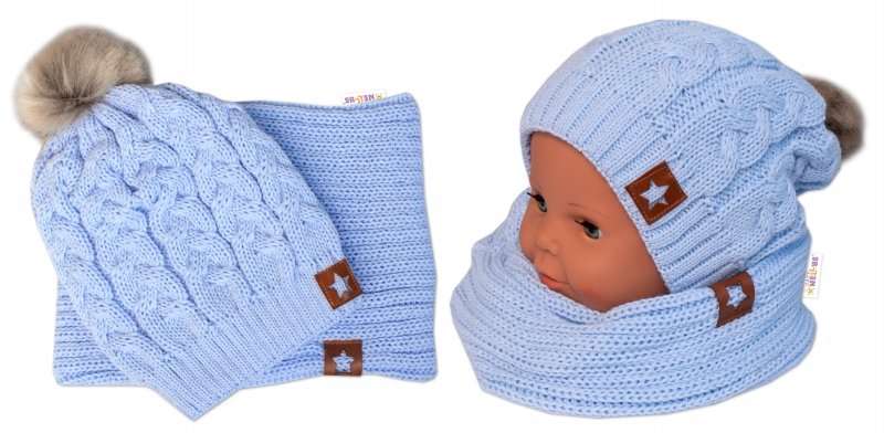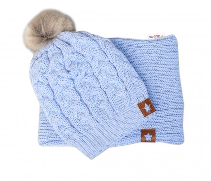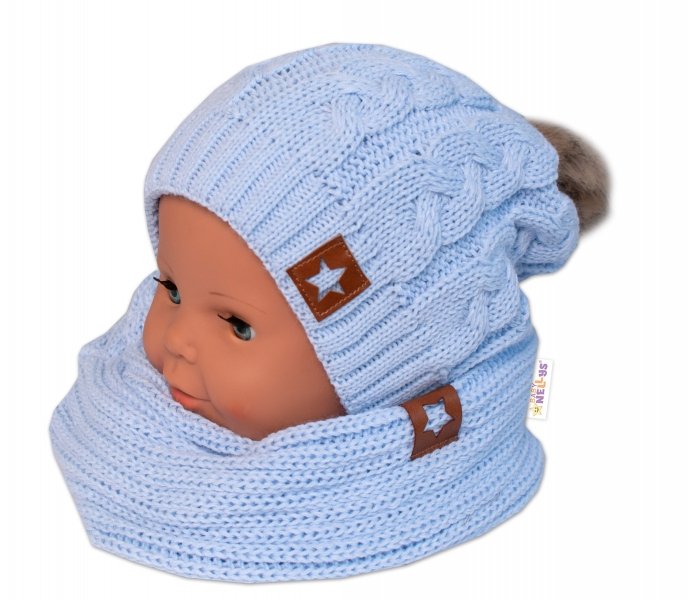 BABY NELLYS Zimní dvouvrstvá čepice s bambulí + komínek Star, sv. modrá - 104-110 (3-5r)