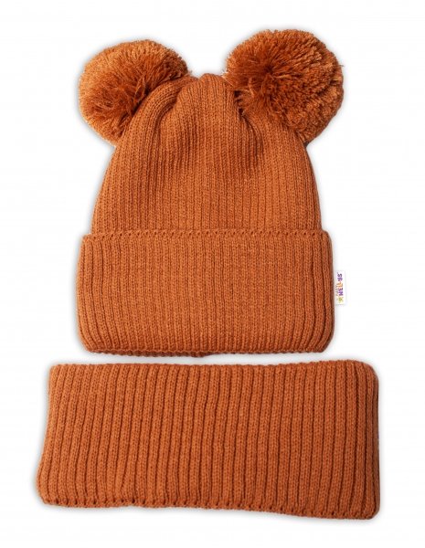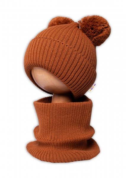 BABY NELLYS Zimní pletená čepice + nákrčník - hnědá s bambulkami - 92-98 (18-36m)