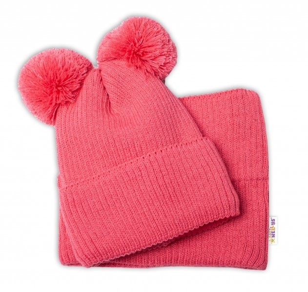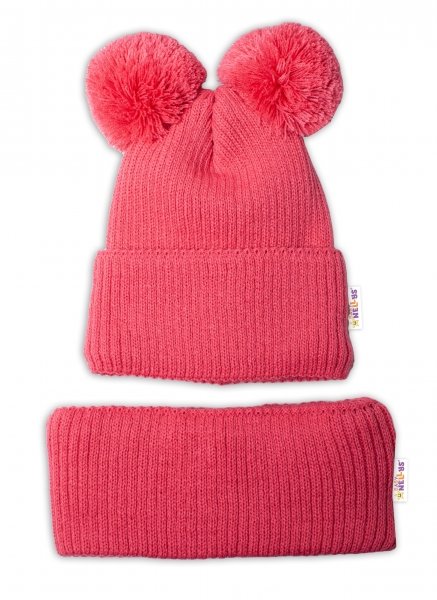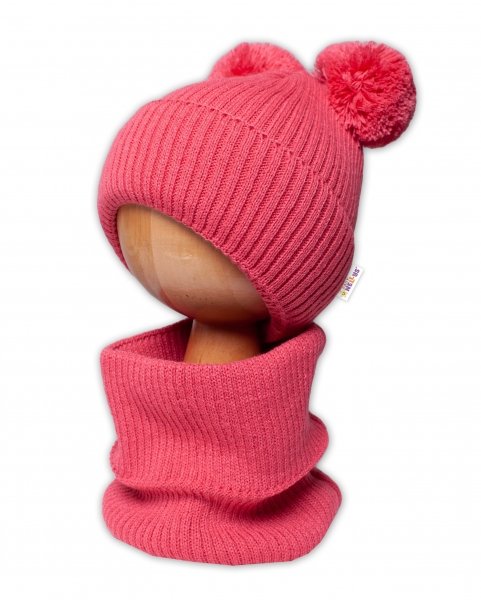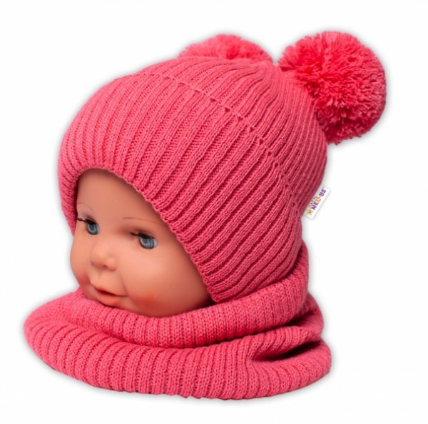 BABY NELLYS Zimní pletená čepice + nákrčník - malinová s bambulkami - 92-98 (18-36m)
