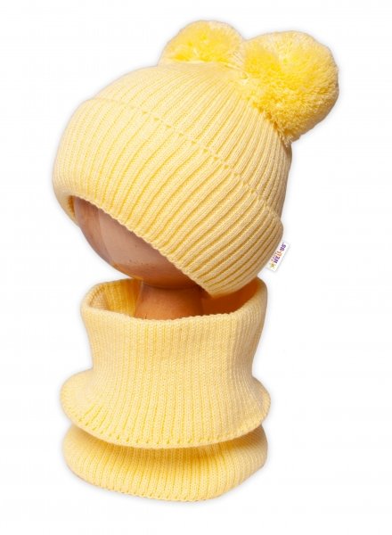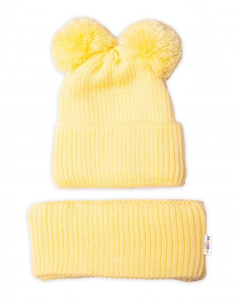 BABY NELLYS Zimní pletená čepice + nákrčník - žlutá s bambulkami - 92-98 (18-36m)