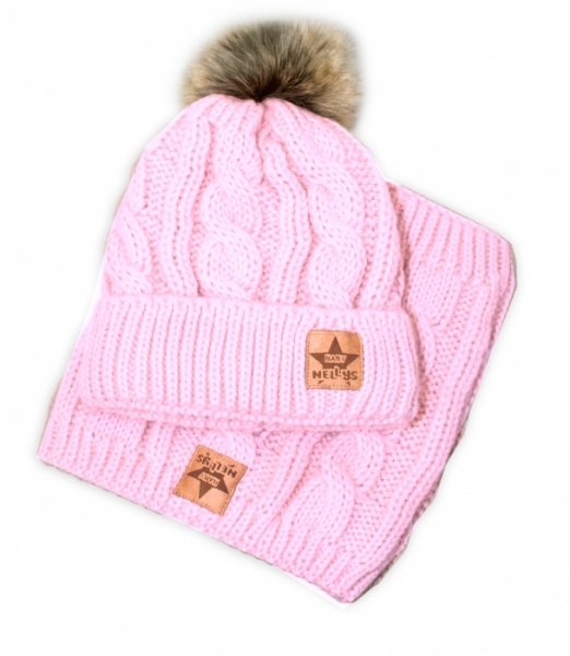 BABY NELLYS Zimní pletená čepice s bambulí + komínek, světle růžová