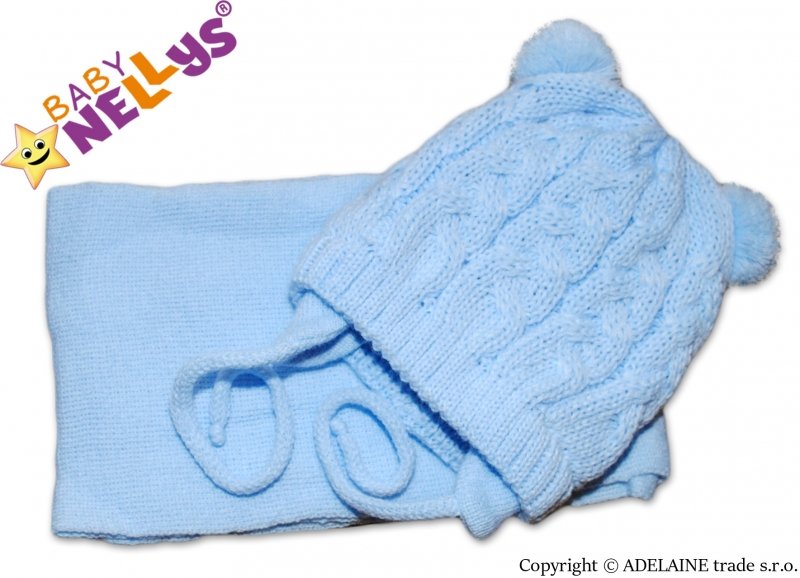 BABY NELLYS Zimní pletená čepička s šálou Mimi Bear - modrá s bambulkami - 34/36 čepičky obvod