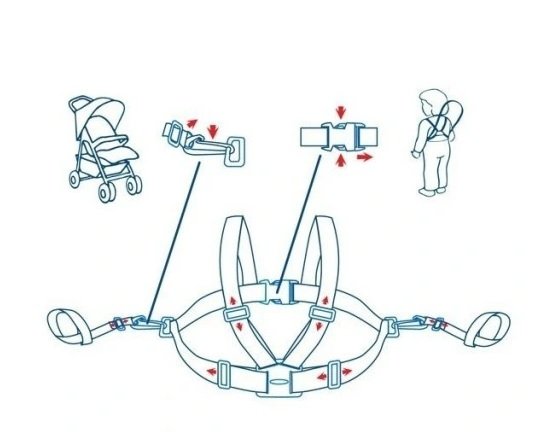 Regulace délky řemínků umožnuje přuzpůsobit je dětské výšce a věku, a také velikosti kočárku.