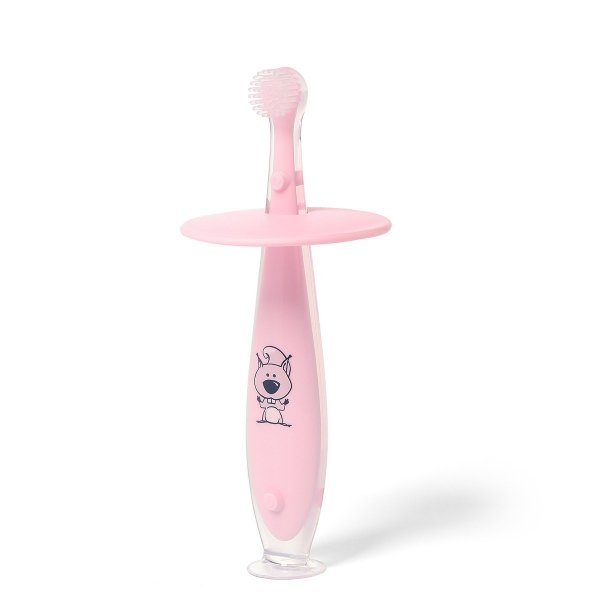 Jemný silikonový zubní kartáček se zarážkou, která zabraňuje jeho příliš hlubokému vložení do úst.