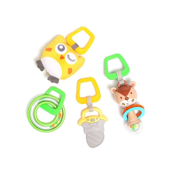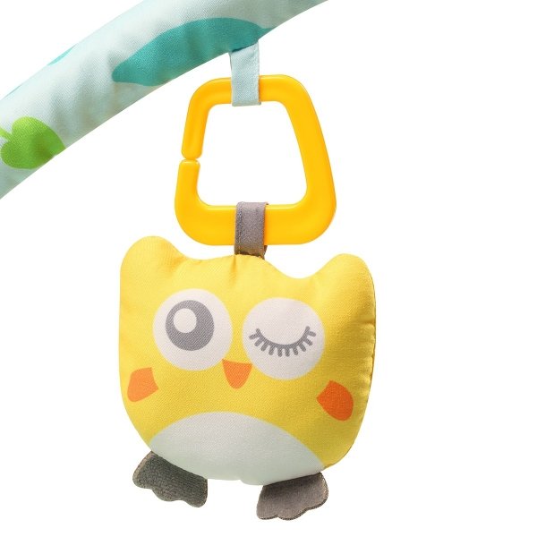 Obsahuje sedm odnímatelných hraček (3 kousátka, 3 chrastítka a měkká pískací sova).