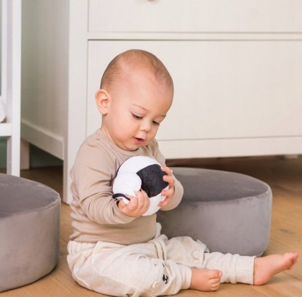 Hračka je vyrobena z kvalitních materiálů, má bezpečnostní certifikát CE. Zde je měkký balónek, který je zároveň pískacím chrastítkem. Hračka podporuje koordinaci oko-ruka, učí se uchopovat a jemně vás zavede do světa zvuků, při zatřesení slyšíte padat korálky.