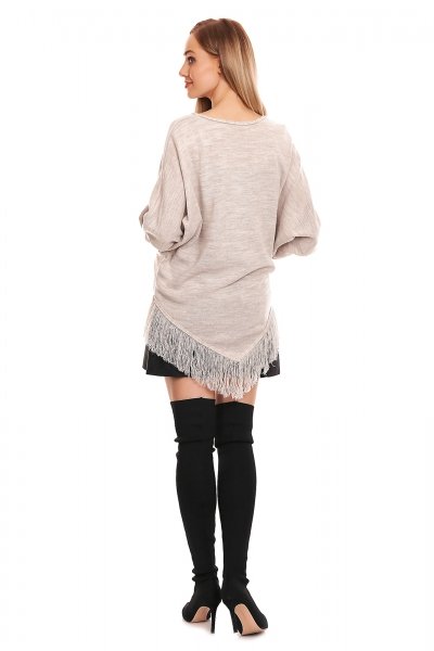 Pončo má dlouhé rukávy a je zakončené střapci.
