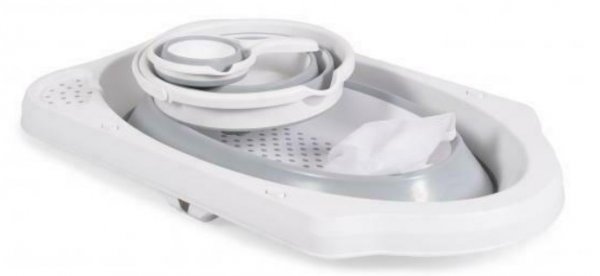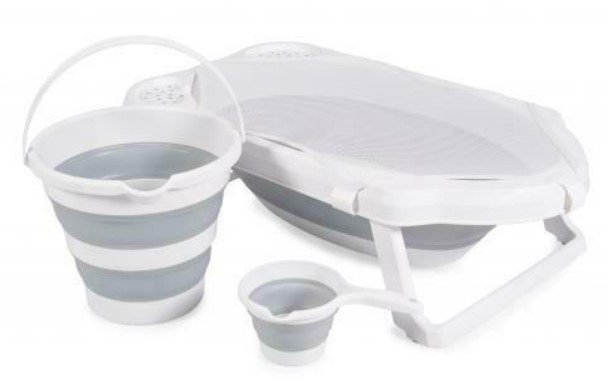 Sada obsahuje: skládací vanu, hrnek, vědro na vodu a vanovou síťku.