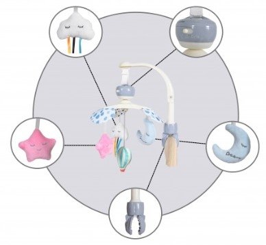 Stimuluje sluchové a zrakové vjemy dítěte a přispívá také ke snadnějšímu usínání miminka a jeho klidnému spánku.