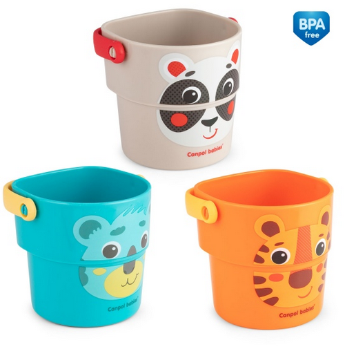 Barevné kyblíčky HELLO LITTLE se zajímavým potiskem jsou ideální pro koupání.