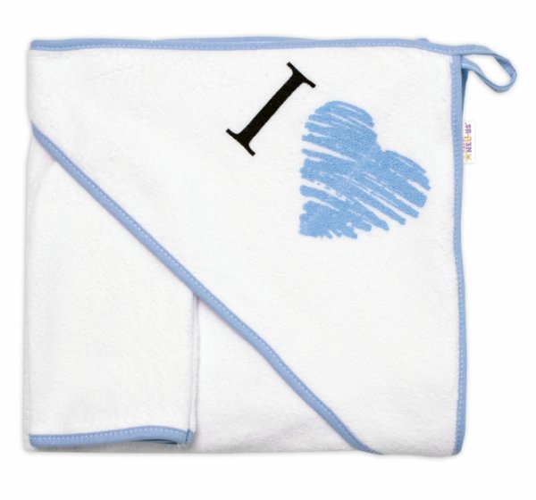 Dětská osuška s kapucí + žínka I love, Baby Nellys, roz. 80 x 80 cm - bílo/modrá