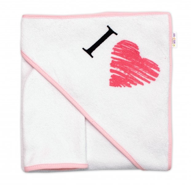 Dětská osuška s kapucí + žínka I love, Baby Nellys, roz. 80 x 80 cm-bílo/růžová