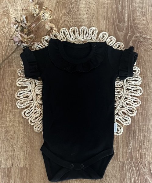 Dětské body, kr. rukáv Mamatti, zap. u krku, Baby Mouse - černé s volánky, vel. 98 - 98 (2-3r)