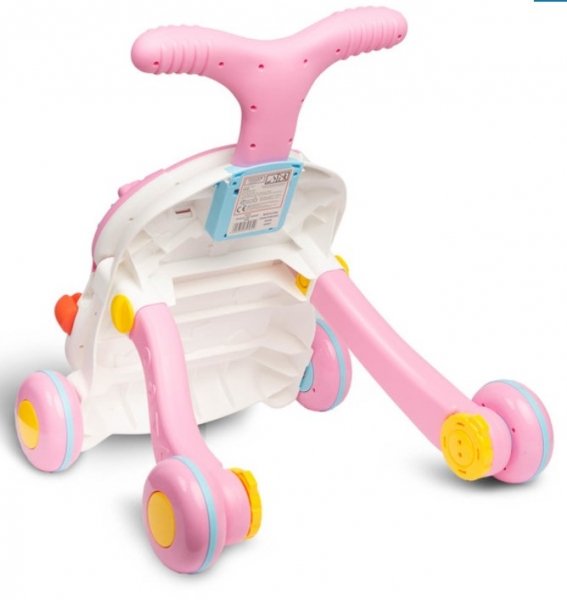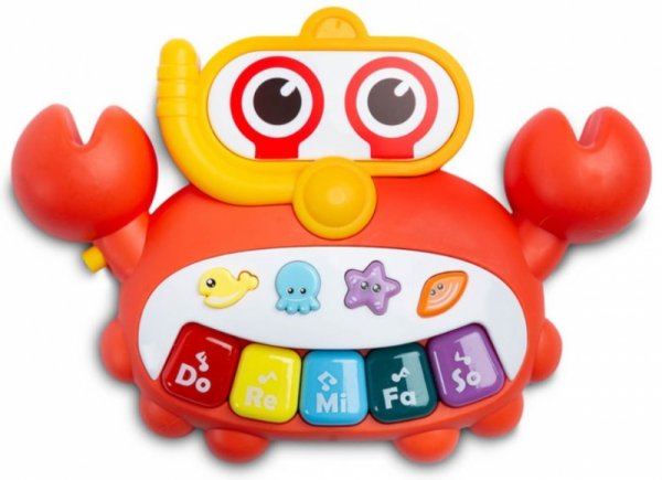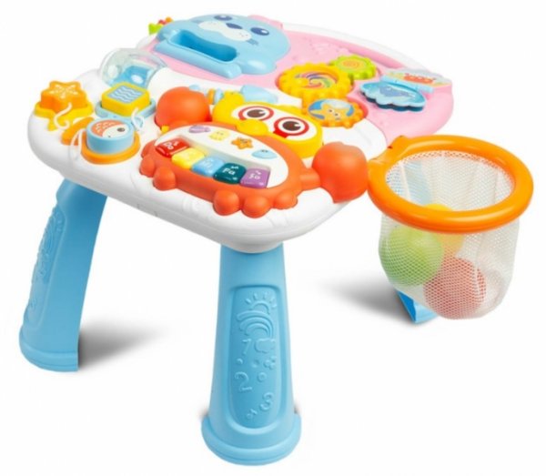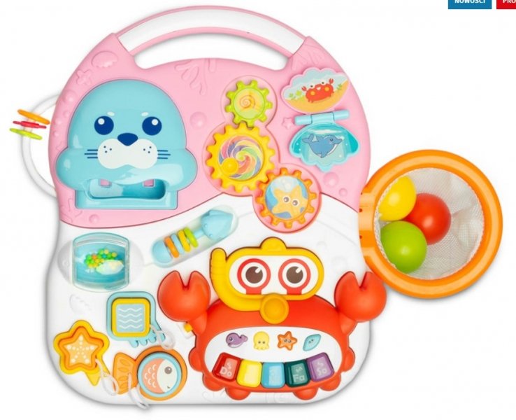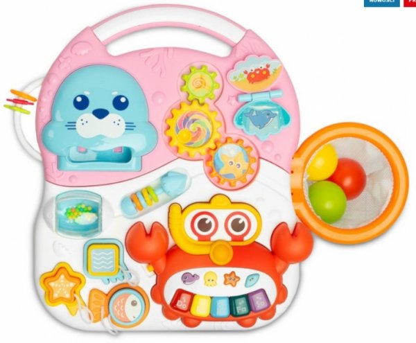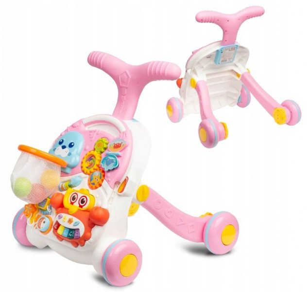 Vzdělávací hračka z řady TOYZ Activity, ideální pro dítě, které již začalo dělat první krůčky. Díky kombinaci několika možností v jedné hračce zabaví vaše batole na mnoho hodin. Dá se použít jako odstrkovadlo nebo interaktivní stůl se spoustou atrakcí. Čas zpříjemní košík, do kterého může vložit 3 plastové míčky s chrastítkem, bateriové a odnímatelné piano ve tvaru kraba, točící se ozubená kola a mnoho dalších překvapení. Přední panel lze sejmout a proměnit v hrací stolek.