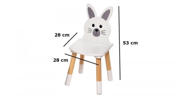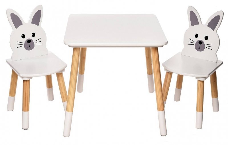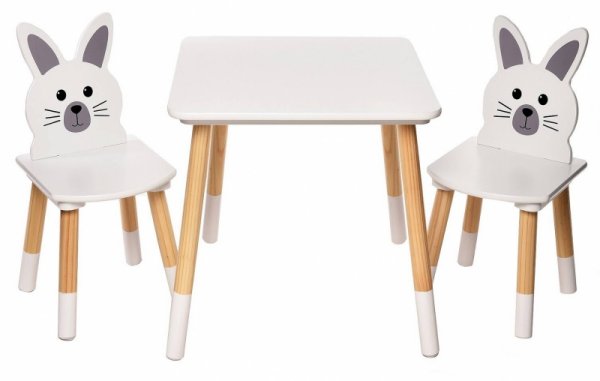 Nádherný dětský stůl v bílém provedení s židličkami s motivem zajíčka. Stoleček je ideálním místem pro hraní, malování, občerstvení nebo pro posezení s kamarády. Originální doplněk do dětského pokoje, praktický, přizpůsobený dětským potřebám. Nábytek je stabilní, snadno se čistí.