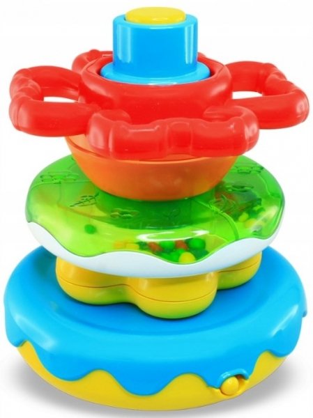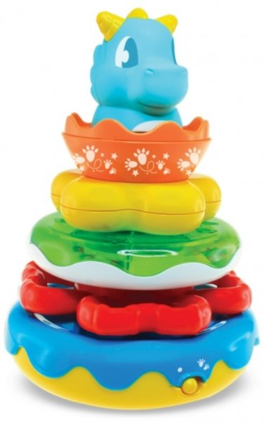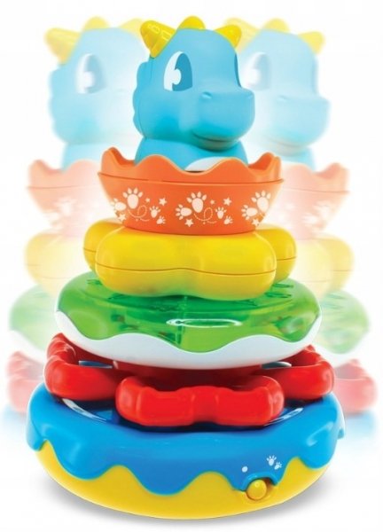 Bavte se s dinosaurem stavěním pyramidy z barevných kroužků a poslechem veselé melodie. Pohádkově barevný dinosaurus má až 4 prsteny, z nichž jeden chrastí. Malý se může libovolně přeskládat, vytvářet pyramidu nebo si s nimi hrát samostatně. Dino základna se kývá do stran, díky čemuž je zábava ještě zábavnější. Přepínač spustí melodie.