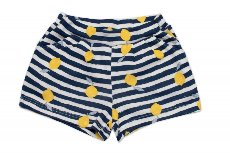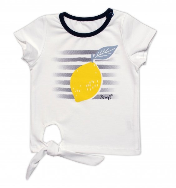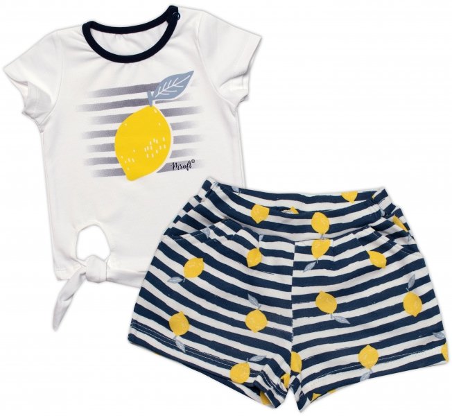 Bílé tričko s krátkým rukávem, zdobené citronovým potiskem a ve spodní části halenky je malý výřez se šňůrkami na zavazování, které podtrhují její prázdninovou atmosféru. Navíc je na rameni košile umístěn patentní knoflík, který usnadňuje oblékání. Šortky jsou potažené proužky a citrony, mají módní volány a dvě kapsy na bocích.