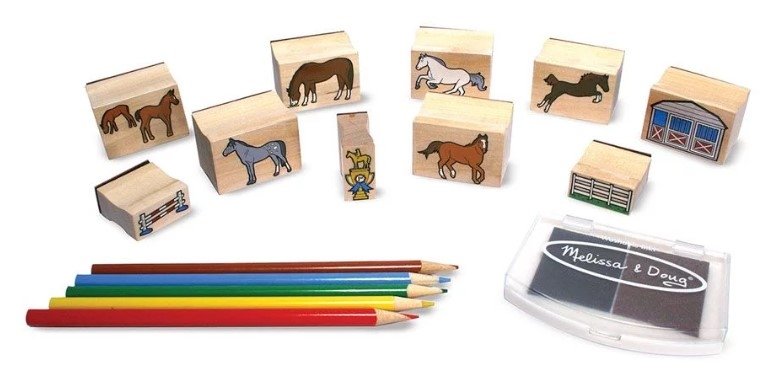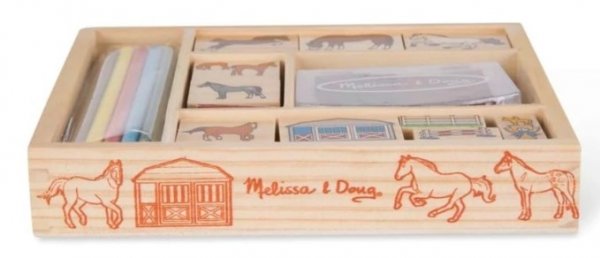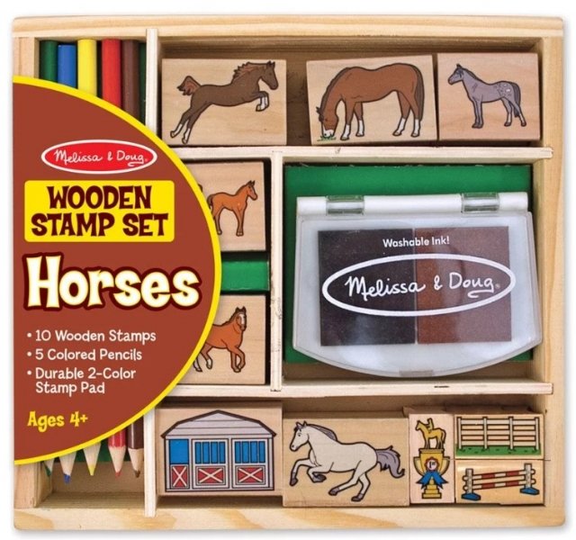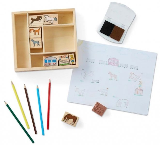 Zábavná razítka jsou zajímavou zábavou nejen pro nejmenší. Stačí okamžik a celá stránka se zaplní koňmi! Pokud se vašemu dítěti tato zvířátka líbí, bude si moci vytvořit vlastní stáj. Přesvědčte se sami, kolik zábavy si s touto jednoduchou a funkční hračkou můžete užít. Díky pastelkám obsaženým v sadě lze odražené tvary ihned vybarvovat.